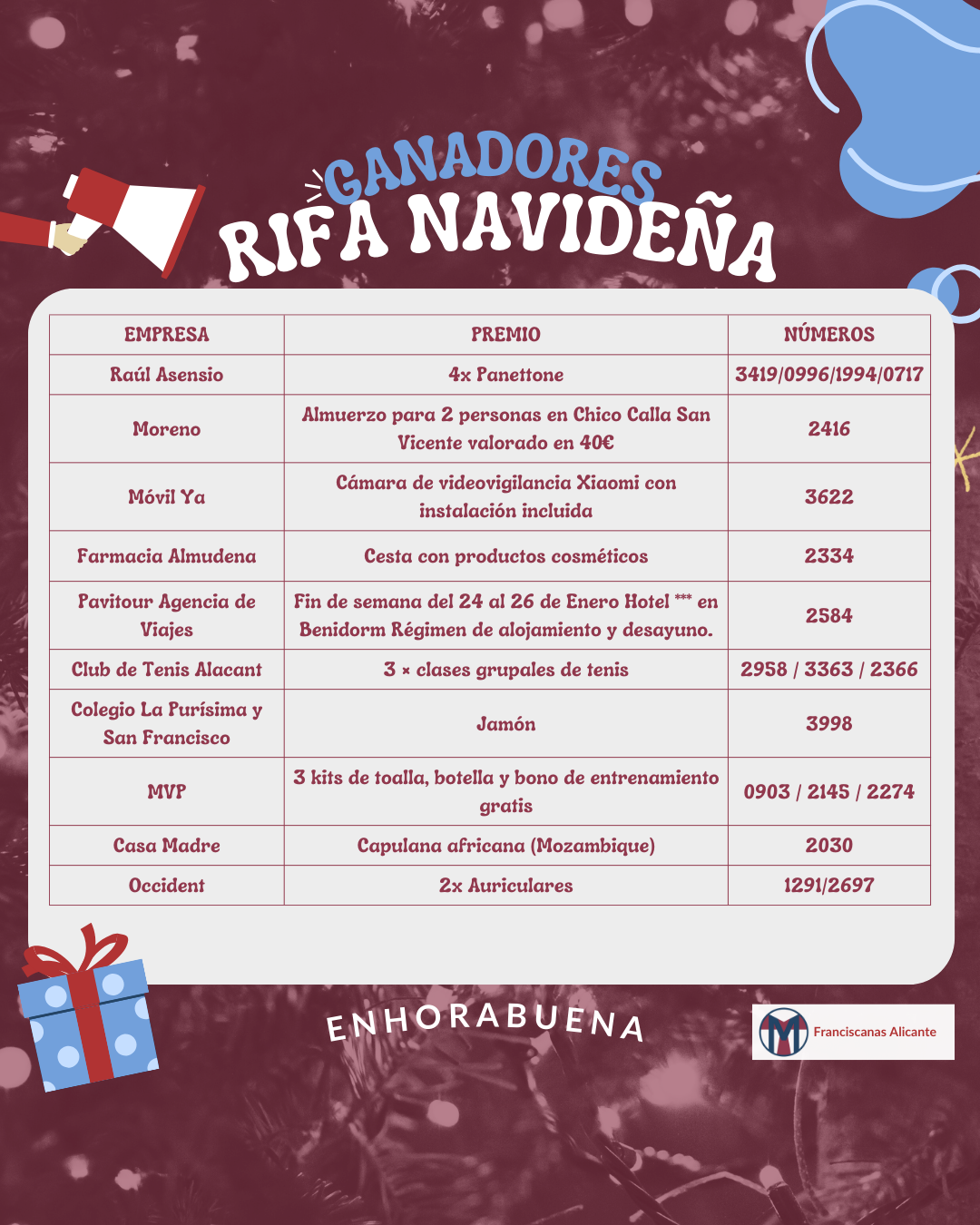Aquí os dejamos los números premiados en la la Rifa Navideña de la Fiesta del pasado viernes. ¡Enhorabuena a los premiados!